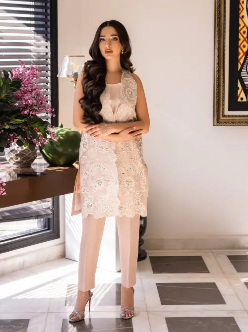 “Step into refined elegance with our embroidered shirt and pants ensemble, crafted from exquisite Italian Georgette fabric. This sophisticated set features: